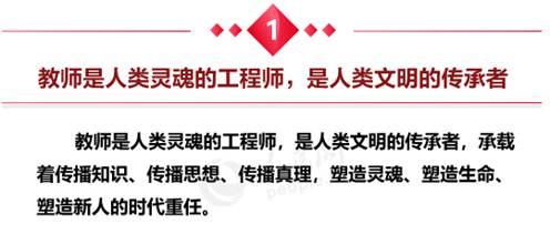习近平强调,建设社会主义现代化强国,对教师队伍建设提出新的更高要求,也对全党全社会尊师重教提出新的更高要求。人民教师无上光荣,每个教师都要珍惜这份光荣,爱惜这份职业,严格要求自己,不断完善自己。做老师就要执着于教书育人,有热爱教育的定力、淡泊名利的坚守。随着办学条件不断改善,教育投入要更多向教师倾斜,不断提高教师待遇,让广大教师安心从教、热心从教。对教师队伍中存在的问题,要坚决依法依纪予以严惩。