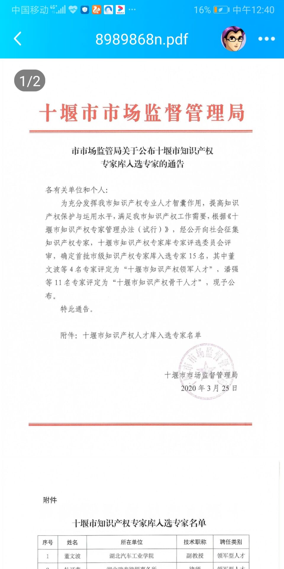 ,十堰市市场监督管理局(知识产权局)下发了《关于公布十堰市知识产权专家库入选专家的通知》,全市遴选了首批知识产权人才15名,其中知识产权领军人才4名,骨干人才11名。德赢官网6位教师获评十堰市知识产权库专家,知识产权研究所所长董文波评定为“十堰市知识产权领军人才”,知识产权基地成继平、范萌、肖玉杰,机械工程学院孙海明、朱炜等5名教师评定为“十堰市知识产权骨干人才”。