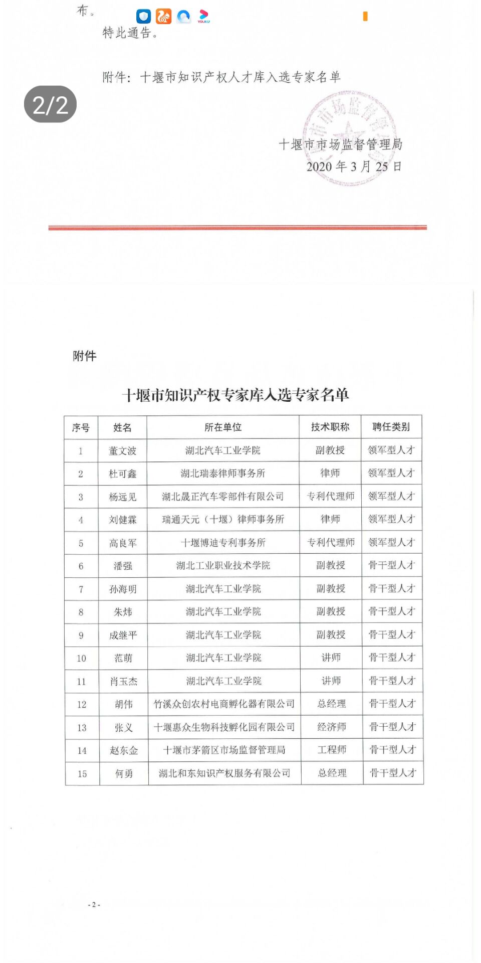 为充分发挥高端知识产权人才的引领辐射和示范带动作用,贯彻落实《国家中长期人才发展规划纲要(2010-2020年)》和《国家知识产权人才“十三五”规划》,加快知识产权人才体系建设,推动知识产权战略实施,十堰市市场监督管理局(知识产权局)根据知识产权高层次人才引领计划,在全市知识产权行政管理部门、知识产权密集型企业、知识产权服务机构、高等学校等范围内开展了知识产权学术带头人、业务骨干等人才的遴选工作,本次遴选的首批知识产权人才主要包括高等学校学术带头人才类、知识产权行政管理与执法人才类、知识产权工程人才类、知识产权服务人才类四大类15人。