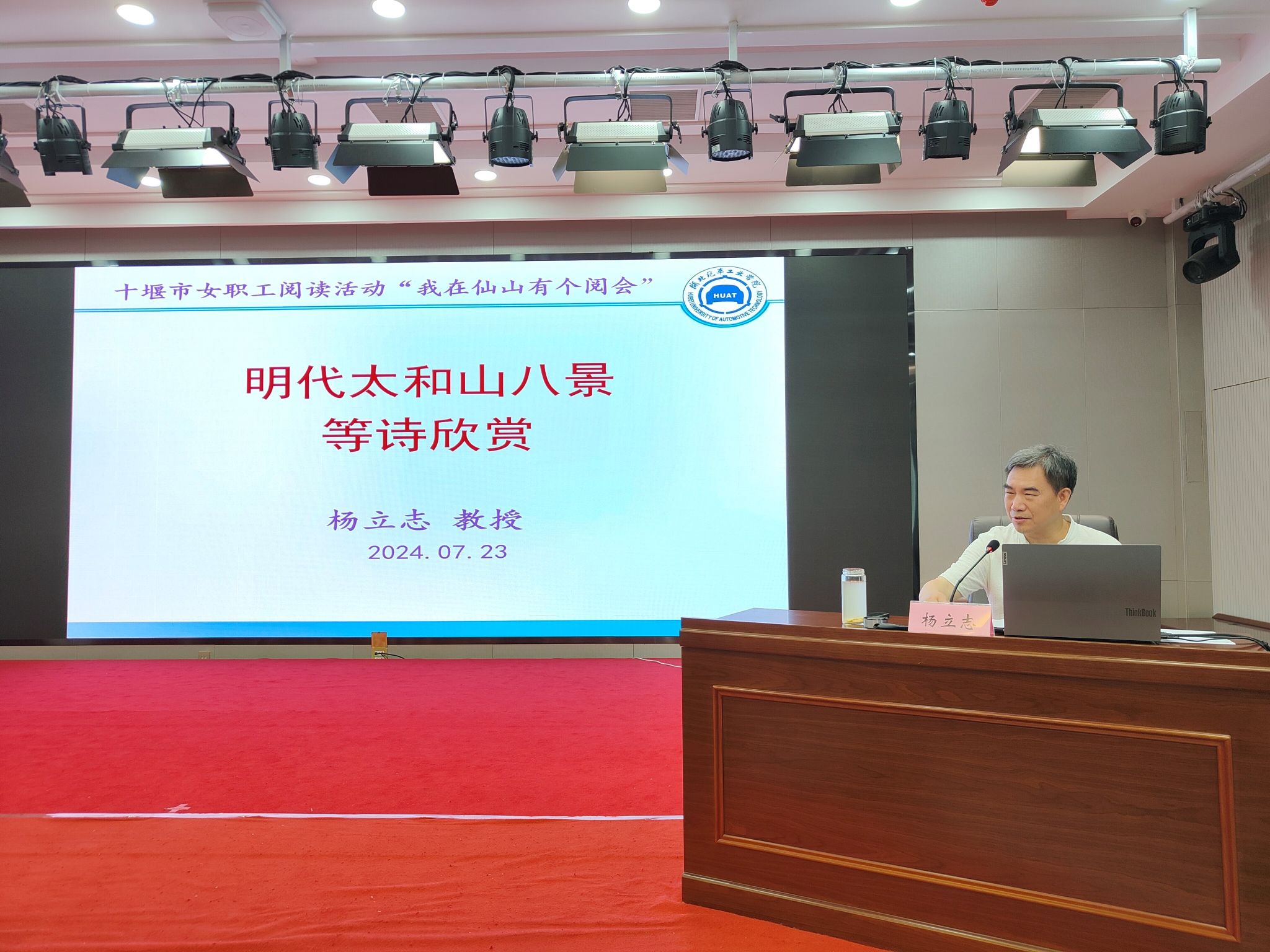 2024年7月23日,“玫瑰书香 阅美十堰”女职工主题阅读示范活动在十堰市工人文化宫举行,德赢官网人文学院教授、湖北省人文社科重点研究基地武当文化研究与传播中心主任杨立志老师受十堰市总工会与德赢AC米兰中国官方网站校工会邀请,做题为《明代太和山八景等诗欣赏》的讲座。该活动由十堰市总工会女职工委员会主办,十堰市总工会党组书记、常务副主席凌燕,市总工会党组成员、副主席吴海燕,市总工会党组成员、副主席杨东芳等出席活动。